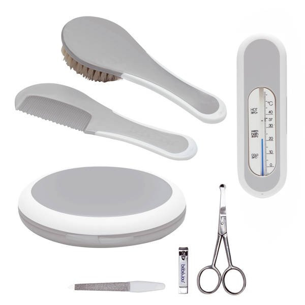 Zestaw akcesoriów do pielęgnacji paznokci zawiera bardzo wygodne i precyzyjne nożyczki, obcinaczkę do paznokci oraz mały pilniczek. Nożyczki mają zaokrąglone końcówki przez co są bardzo bezpieczne. Szczoteczka do włosów wykonana z delikatnego przyjemnego dla główki małego dziecka włosia, w zestawie z grzebykiem idealnie sprawdzi się do delikatnego masażu główki oraz wyczesywania ewentualnej ciemieniuchy. Termometr kąpielowy jest bardzo dokładny. Posiada skalę z odpowiednio zaznaczoną temperaturą jaką powinna mieć woda (37 stopni). Na termometrze znajduje się również skala pokazującą zbyt wysoką i zbyt niską temperaturę wody.