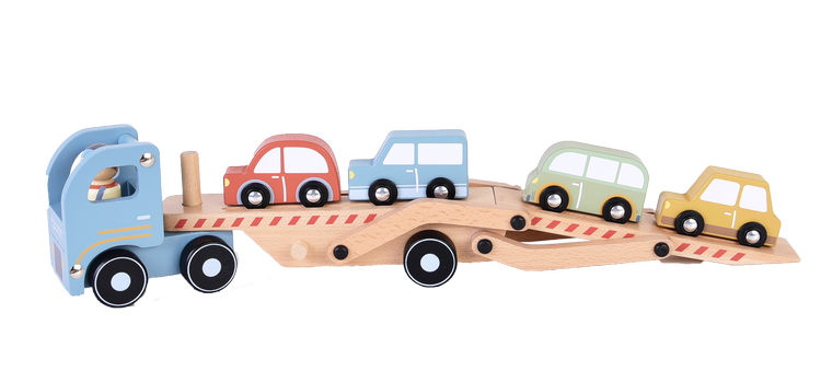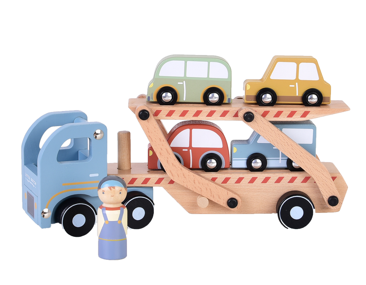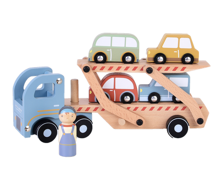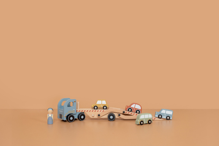 Drewniana laweta z autami FSC Little Dutch. Kłopoty z samochodem na drodze? Dzięki lawecie od Little Dutch to nie problem. Pracowity kierowca szybko pomoże Twojemu dziecku załadować auta i dostarczyć je prosto do warsztatu. Laweta posiada ruchomą, dwupiętrową naczepę, którą można opuszczać, aby samochodziki łatwo opuściły pojazd. W skład zestawu wchodzą: laweta, kierowca, cztery autka. Wszystkie elementy zestawy wykonane są z drewna z certyfikatem FSC i pokryte bezpiecznymi farbami na bazie wody. To fantastyczny prezent dla każdego małego fana motoryzacji, stanowi świetne uzupełnienie dla pozostałych zestawów od Little Dutch.