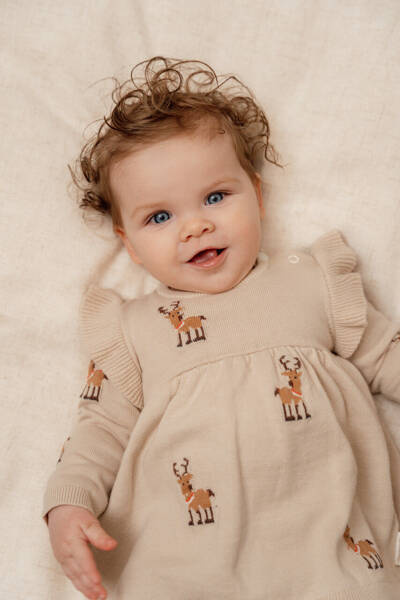 Sukienka z długim rękawem Christmas od Little Dutch. Nadszedł świąteczny czas! Ta urocza i miękka dzianinowa sukienka ze wzorem w renifery to idealny strój na Boże Narodzenie. Ma długie rękawy z eleganckimi falbankami, które dodają jej uroku. Wykonana z certyfikowanej bawełny organicznej. Stanowi świetne uzupełnienie do pozostałych ubranek od Little Dutch.
