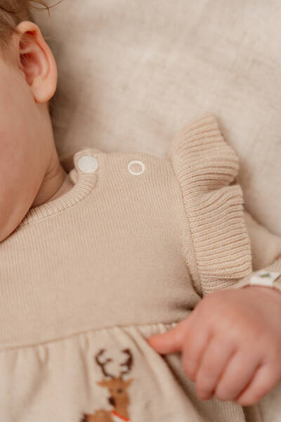 Sukienka z długim rękawem Christmas od Little Dutch. Nadszedł świąteczny czas! Ta urocza i miękka dzianinowa sukienka ze wzorem w renifery to idealny strój na Boże Narodzenie. Ma długie rękawy z eleganckimi falbankami, które dodają jej uroku. Wykonana z certyfikowanej bawełny organicznej. Stanowi świetne uzupełnienie do pozostałych ubranek od Little Dutch.