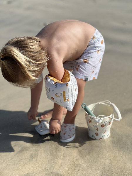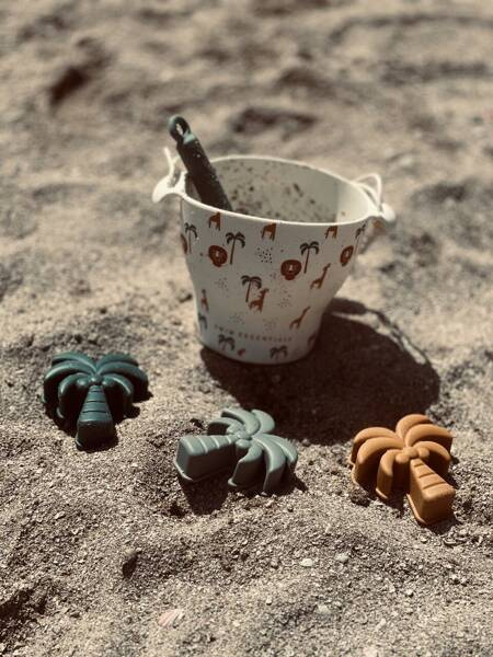 Zestaw zabawek do piasku Jungle. Ten uroczy, silikonowy zestaw zawiera wiaderko z rączką, łopatkę i trzy foremki. Idealnie sprawdzi się na plaży, czy w piaskownicy, gwarantując świetną zabawę! Zabawny design jest wyjątkowy i na pewno przyciągnie uwagę malucha, który z przyjemnością będzie wykorzystywał go podczas zabawy. Do zestawu dołączona jest również siateczkowa torba do przechowywania.
