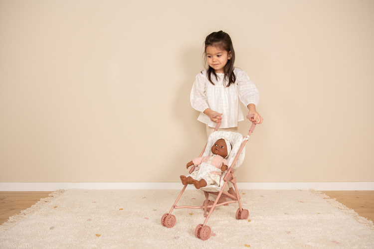 Składany wózek dla lalek od Little Dutch. Dokąd zabierze Cię dzisiaj Twoja wyobraźnia? Posadź swoją ulubioną lalkę lub przytulankę i pozwól wózkowi poprowadzić Cię do nowej przygody. Wózeczek wyściełany jest materiałem ze wzorem White Meadows, a dopasowana torba na uchwytach zapewnia miejsce na akcesoria dla lalek i artykuły potrzebne na spacer. Pasek sprawi, że lalka nie wypadnie podczas spaceru. Składany wózek dla lalek z różową ramą, różowymi miękkimi uchwytami i 4 różowymi kółkami został zaprojektowany tak, aby sprzyjać kreatywnej zabawie i rozwijać poczucie odpowiedzialności małych opiekunów. Można go łatwo złożyć, co ułatwia przechowywanie. Obserwuj, jak Twoje maleństwo radośnie pcha wózek dla lalek, śpiewa kołysanki i przystaje, by nakarmić lub pocieszyć swoje udawane dziecko. Zabawka uczy cennych umiejętności życiowych poprzez magię zabawy.