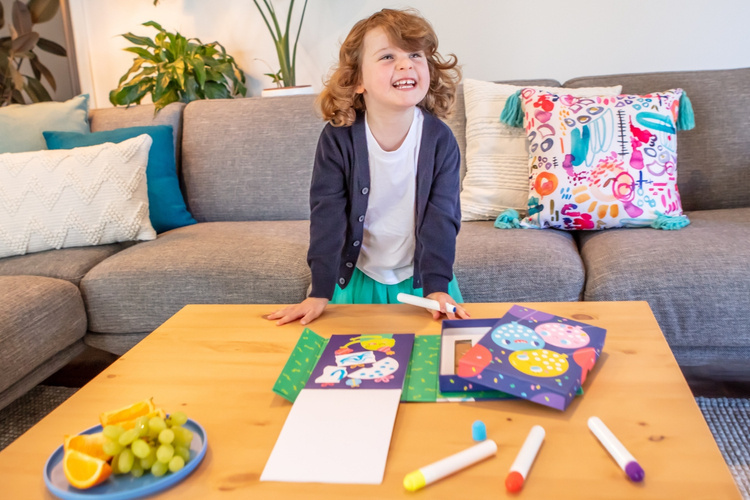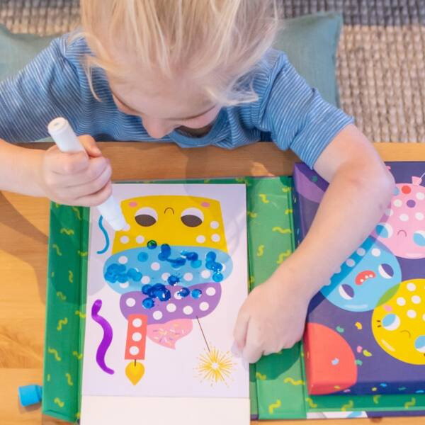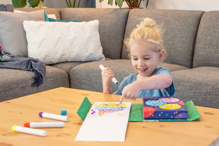 Zestaw Kropkowe Markery - Impreza od Tiger Tribe to zestaw aktywności dla przedszkolaków z farbkami w formie markerów. Wystarczy odkręcić nakrętkę, ścisnąć końcówkę i zabawa może się zacząć. Bez kubków i pędzli, brudzenia i rozlewania. To wszystko sprawia, że Kropkowe Markery to ulubione farby każdego rodzica. Maluchy natomiast pokochają eksperymentowanie z różnymi efektami, które można uzyskać za pomocą okrągłego aplikatora w formie gąbki — od zabawnych kropek po mieszanie i nakładanie warstw, a także szerokie pociągnięcia kolorem. A wszystko to przy jednoczesnym ćwiczeniu umiejętności motorycznych.