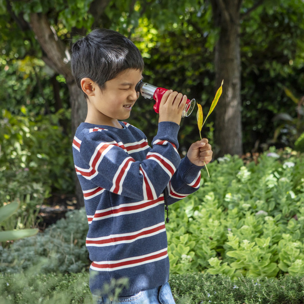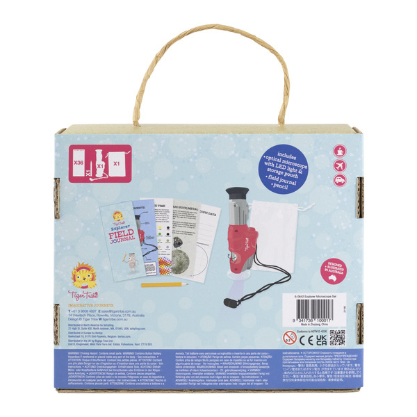 Zestaw Małego Odkrywcy - Mikroskop od Tiger Tribe. Zaprojektowany, aby rozbudzić ciekawość i zachęcić do obserwacji natury. Dzieci pokochają odkrywanie otaczającego je świata dzięki temu zestawowi. Ręczny mikroskop został specjalnie zaprojektowany, aby był lekki do użytku w terenie. Prosty w obsłudze, posiada dwa powiększenia (x20 i x60) oraz zasilane bateryjnie światło LED do oświetlania próbek. Dołączona książeczka zawiera instrukcje, zadania praktyczne, inspirujące pomysły na eksperymenty i wiele więcej. Chociaż ten potężny mikroskop dla dzieci świetnie powiększa, posiada delikatną osłonę soczewki, aby zapewnić lekkość użytkowania podczas eksploracji na zewnątrz.