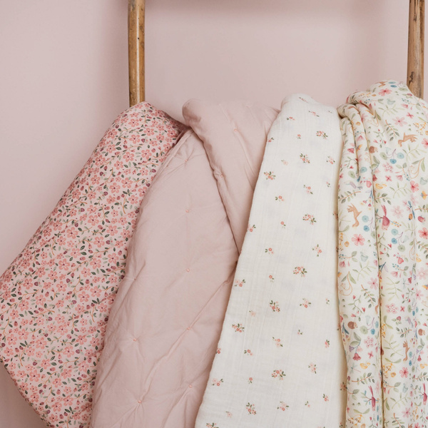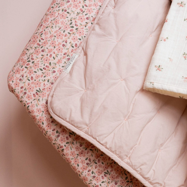 Kołderka 70x100 cm Blossom od Little Dutch. Miękka pikowana kołderka, która zapewnia dziecku cudowne ciepło i komfort. Dzięki miękkiej pikowanej bawełnie z jednej strony, z wyhaftowanymi kropkami, oraz przyjemnej tkaninie interlock z drugiej, może być używana jako kocyk do łóżeczka, narzuta lub mata do zabawy. Delikatny różowy kolor Blossom wnosi do pokoju dziecięcego przytulność i spokój, a także pięknie łączy się z innymi produktami z kolekcji Fairy Garden.