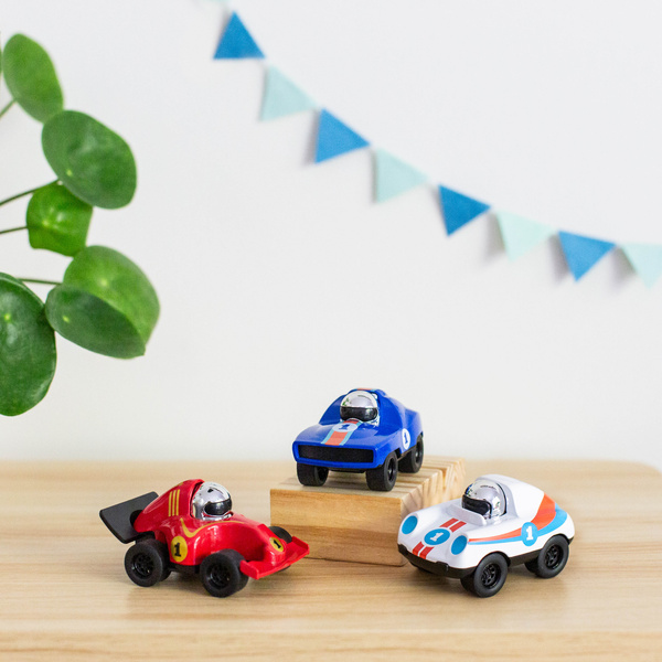 Autko wyścigowe Białe od Tiger Tribe. Ten turbo-szybki, retro mini samochód wyścigowy jest gotowy do jazdy! Nie potrzebuje baterii. Dzieci będą się świetnie bawić ścigając się tym zwinnym, małym autkiem, aktywując mechanizm wyścigowy prostym naciśnięciem. Autka są dostępne są w trzech zabawnych i kolekcjonerskich wzorach.