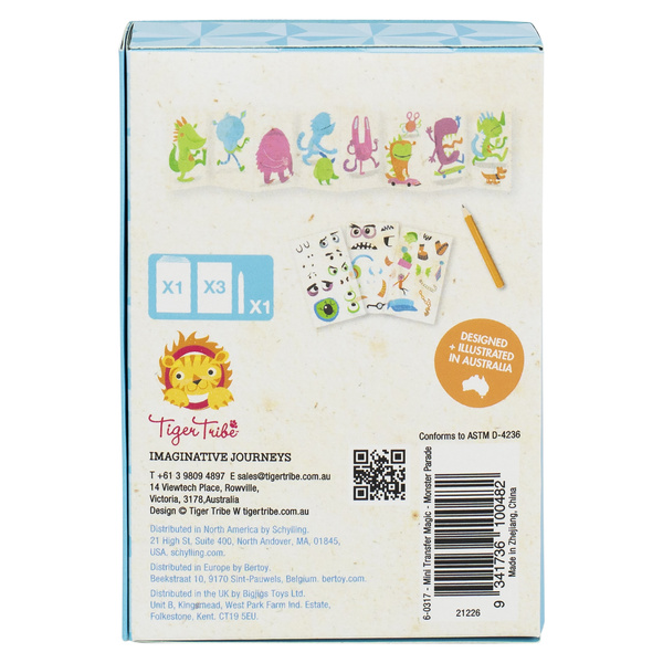 Zestaw z Folią Transferową - Wesołe Potworki od Tiger Tribe to uroczy zestaw do zabawy w nowym, super kompaktowym formacie, w którym dzieci wykorzystują swoją wyobraźnię, aby tworzyć własne kreatywne kombinacje. Wystarczy wybrać arkusz kalkomanii, usunąć papier podkładowy, umieścić wybrany element kalkomanii na szablonie potworka i pocierać ją dołączonym ołówkiem. Zaprojektowane do bezproblemowej, przenośnej zabawy, wszystko jest starannie zapakowane w poręczne pudełko.
