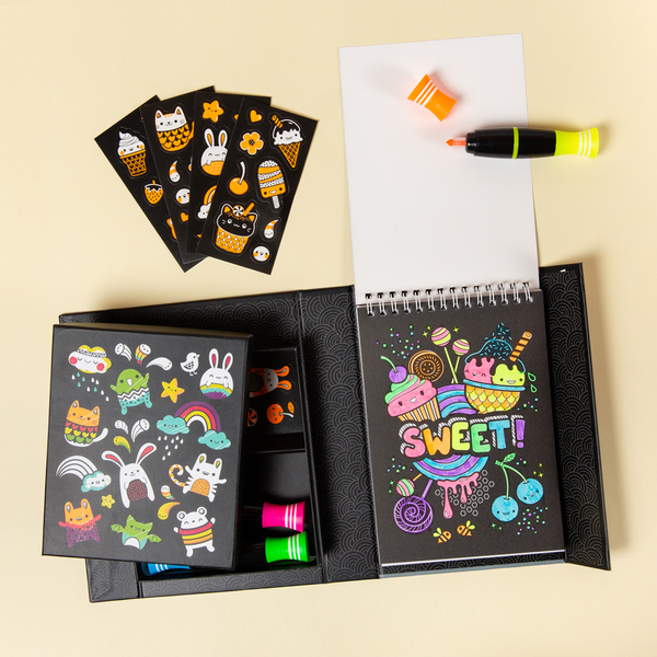 Zestaw Kolorowanek Neonowych - Świecące Stworki od Tiger Tribe to kreatywny zestaw wypełniony po brzegi aktywnościami, neonowymi markerami i naklejkami. Zestaw zaprojektowany tak, aby Tygryski były zajęte w podróży - w jednym pudełku z magnetyczną klapką, aby bezpiecznie przechowywać zawartość. Zaprojektowane z myślą o przenośnej zabawie zestawy do kolorowania Tiger Tribe stanowią świetną alternatywę dla czasu spędzonego przed ekranem, promując uważność, relaks i odprężające zajęcie.