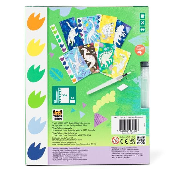 Przenośne Kolorowanki Wodne – Dinozaury od Tiger Tribe. Maluchy mogą odkrywać malowanie bez bałaganu dzięki temu przenośnemu zestawowi. Kolorowanka wodna to idealne wprowadzenie do malowania dla maluchów. Zestaw zawiera 16 pięknie ilustrowanych stron z motywem wesołych dinozaurów (z opisem każdego gatunku). Na każdej stronie znajduje się zestaw farbek z kolorami dopasowanymi do danego obrazka. Malowanie odbywa się z pomocą bezpiecznego i czystego pędzelka wodnego. Każde dzieło sztuki można wyrwać z zestawu i oprawić w ramki.