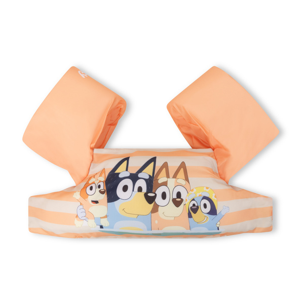 Puddle Jumper Bluey od The Swim Essentials. Idealnie sprawdzi się do nauki pływania i zapewnienia wyjątkowego bezpieczeństwa podczas zabawy w wodzie. Piankowy pas piersiowy z rękawkami zapinany jest na klamrę, co zapobiega wyślizgnięciu się dziecka. Obwód można regulować, dostosowując go do wymiarów klatki piersiowej dziecka. Dzięki użyciu pianki jako głównego materiału puddle jumper jest wyjątkowo lekki i wygodny. Przeznaczony jest dla dzieci o wadze do 30 kg. Puddle jumper jest idealny do zabrania ze sobą na wakacje nad jezioro, czy nad morze, ale świetnie sprawdzi się również na basenie.