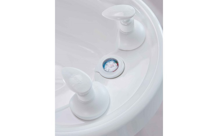 Wanienka Thermo Bath z innowacyjnym systemem zintegrowanego termometru do mierzenia temperatury wody, aby kąpiel maluszka była jak najbardziej bezpieczna i komfortowa. Wanienka zawiera dodatkowo dwa dyspensery na mydełko i szampon. Posiada wewnątrz specjalny uskok, który zapewnia bezpieczeństwo dzieciom już siedzącym. Wygodny system odpływowy z wężykiem, który umożliwia szybkie opróżnienie wanienki. Wanienka jest obszerna, wygodna dla rodziców do kąpieli dziecka. Wykonana z najbezpieczniejszego tworzywa PP (stosowanego przy produktach żywnościowych). Możliwość montażu do stojaka Bebe-Jou z systemem Click.