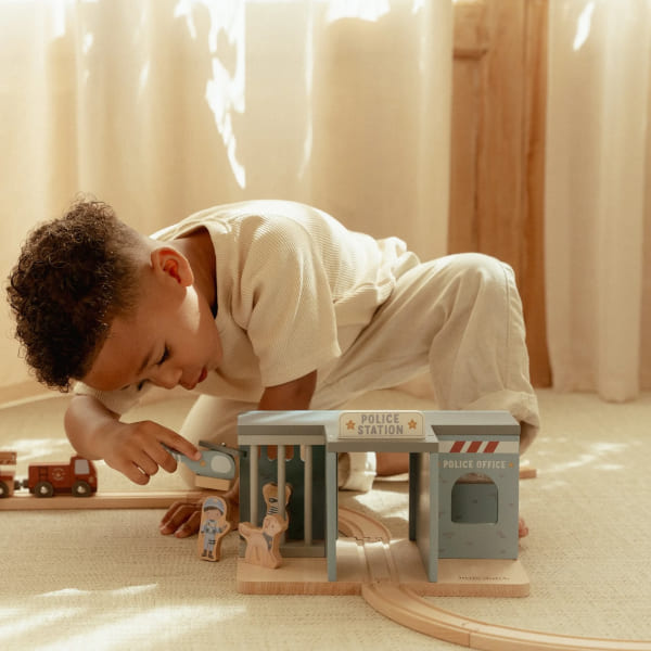 Drewniany posterunek policji Little Dutch jest fantastycznym sposobem na długie godziny ciekawych zabaw. Zestaw zawiera helikopter, auto, figurki policjanta i złodzieja. Elementy są starannie wykonane z drewna z certyfikatem FSC (Forest Stewardship Council), malowane są bezpiecznymi farbami na bazie wody. Piękna, delikatna kolorystyka.