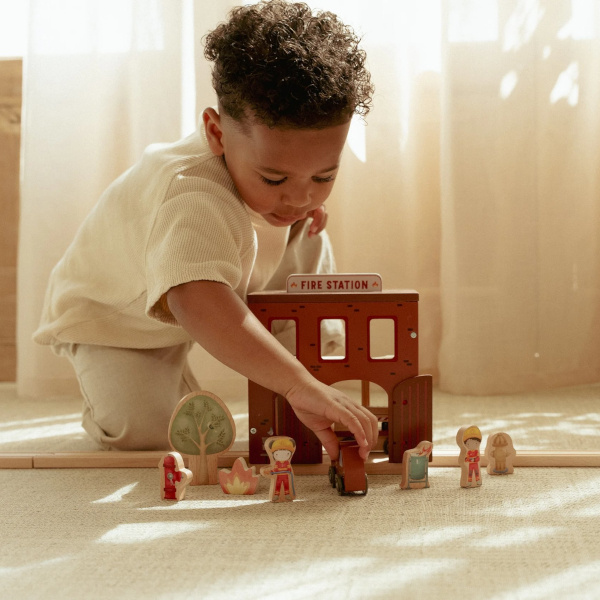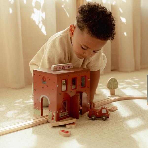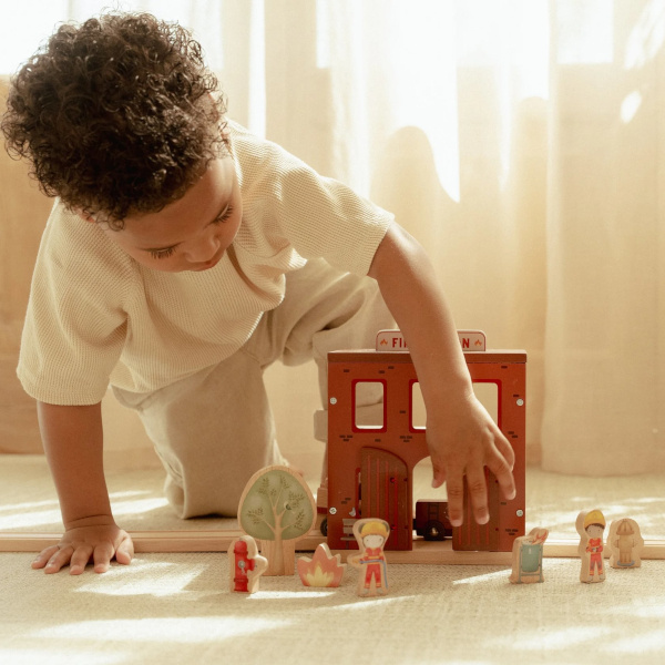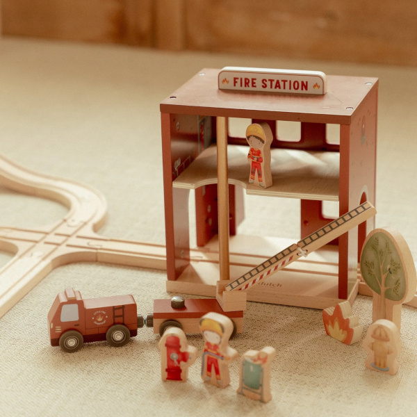 Drewniana remiza strażacka Little Dutch jest fantastycznym sposobem na długie godziny ciekawych zabaw. Zestaw zawiera remizę strażacką , auto straży pożarnej z wysuwaną drabiną, figurki strażaków wraz z psem pomocnikiem, hydrant , drzewka oraz ogień który trzeba ugasić. Elementy są starannie wykonane z drewna z certyfikatem FSC (Forest Stewardship Council), malowane są bezpiecznymi farbami na bazie wody. Piękna, delikatna kolorystyka.