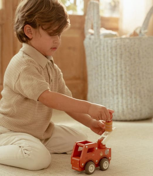 Drewniane auto straż pożarna z wyjmowanym ludzikiem. Wykonane z drewna, pomalowane bezpiecznymi farbami na bazie wody. Łatwy i wygodny do chwytania przez małe rączki.
