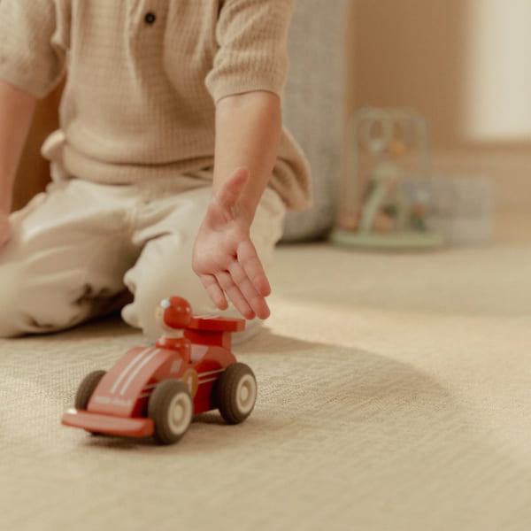 Na miejsca, przygotować się… i w drogę! Drewniane wyścigówki od Little Dutch to zestaw, który wciągnie każdego małego fana motoryzacji. W komplecie znajdują się dwa auta w żywych kolorach – czerwonym i niebieskim – oraz zabawne, wymienne ludziki–kierowcy. Wystarczy naciągnąć mechanizm typu pull-back, puścić i obserwować, jak samochodziki mkną po podłodze prosto do mety!