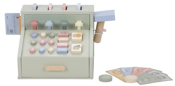 Drewniana kasa od Little Dutch to wyjątkowa propozycja dla małych sprzedawców i kupujących. Wykonana z certyfikowanego drewna FSC, zachwyca pięknym retro designem oraz nową, pastelową kolorystyką. Zestaw zawiera wszystkie akcesoria niezbędne do zabawy w sklep: terminal płatniczy, monety, banknoty oraz praktyczną szufladę kasową.