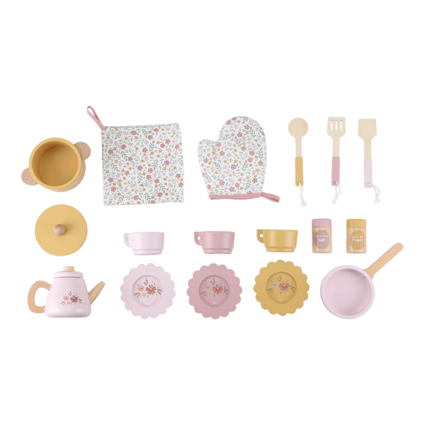 Drewniana kuchnia Little Dutch w odcieniu pięknego różu to wyjątkowa zabawka, która przeniesie Twoje dziecko w świat gotowania i pieczenia. W zestawie znajduje się wszystko, czego potrzeba do kulinarnych przygód. Kuchnia ma także zlew z kranikiem, półeczki na zapasy ukryte za materiałową zasłonką, a nawet piekarnik z pokrętłami. Całość dopełniają tkaninowe akcesoria – rękawica i ściereczka w pastelowym wzorze Soft Flowers.