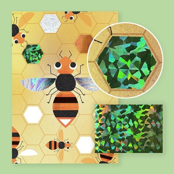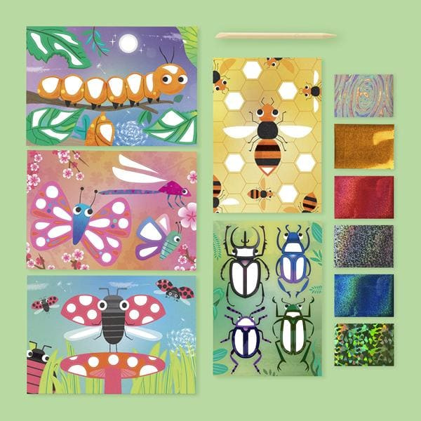 Sympatyczne robaczki czekają, aż ożywisz je dzięki błyszczącej folii holograficznej. Wystarczy wybrać ilustrowaną kartę i za pomocą dołączonego drewnianego patyczka odkleić białe sekcje od obrazka, odsłaniając sekcje z klejem. Następnie na klejące miejsca wystarczy nałożyć folię i piękny, mieniący się obrazek gotowy! Zestaw dla aspirujących artystów. Trenuje precyzję i pozwala tworzyć obrazki, które z powodzeniem ozdobią ściany w dziecięcym pokoju.
