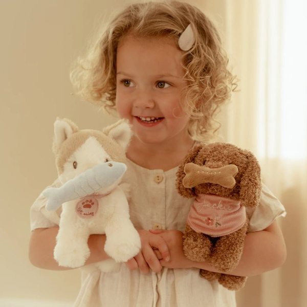 Dla małych miłośników piesków mamy Jackie – przytulankę w pięknej torebce z kwiatowym nadrukiem. Psiak posiada miękkie futerko, różową bandamkę z wyszytym swoim imieniem oraz to co wszystkie psiaki lubią najbardziej, czyli kosteczkę do zabawy. Kostka posiada magnes i jest ulubioną zabawką Jackie. Oczka psiaka są wyszyte. Dzięki specjalnej torbie transportowej, każdy maluch może zabrać psiaka wszędzie ze sobą, czy to na wycieczkę, czy do babci a może nawet do przedszkola. Torebka ma otwór z przodu, przez którą nasz zwierzak może swobodnie spoglądać. Jackie z pewnością stanie się ukochanym towarzyszem. Do kompletu polecamy kotka Marleya.