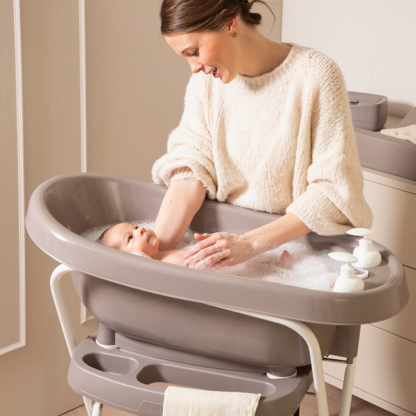 Stojak kompatybilny jest z klasycznymi wanienkami Bébé-jou, wanienkami z kolekcji Fabulous, wanienkami Thermo oraz ze wszystkimi wiaderkami kąpielowymi.