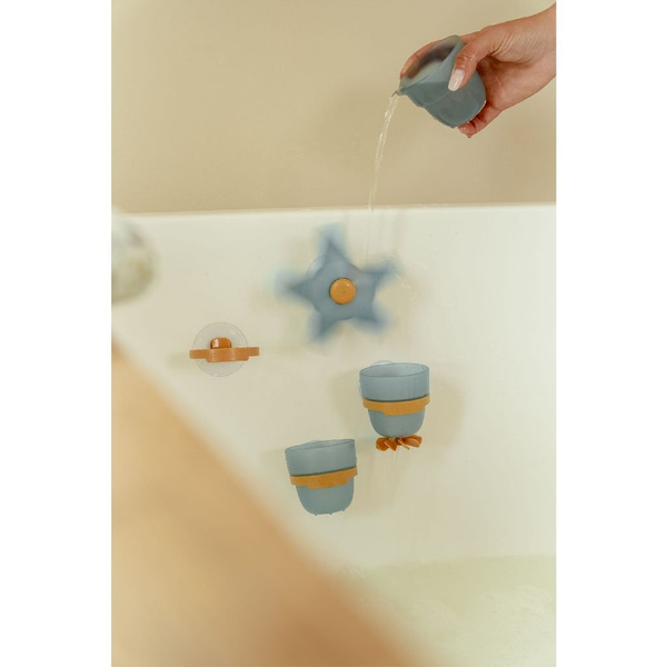 Kubeczki do wodnej zabawy Rozgwiazda od Little Dutch. Zmień czas kąpieli w ciekawą zabawę dzięki temu niebieskiemu zestawowi kubeczków kąpielowych! Zestaw składa się z wirującego koła w kształcie gwiazdy, dwóch wesołych kubeczków kąpielowych oraz poręcznego kubka do nalewania. Dzięki przyssawkom można je łatwo przymocować do wanny lub ściany prysznica. Wlej wodę do gwiazdy i zobacz, jak koło zaczyna się kręcić. Zabawa wodą stymuluje ciekawość i rozwija zdolności motoryczne. Dzięki łagodnym kolorom i sprytnej konstrukcji możecie wspólnie cieszyć się najpiękniejszymi wodnymi przygodami.
