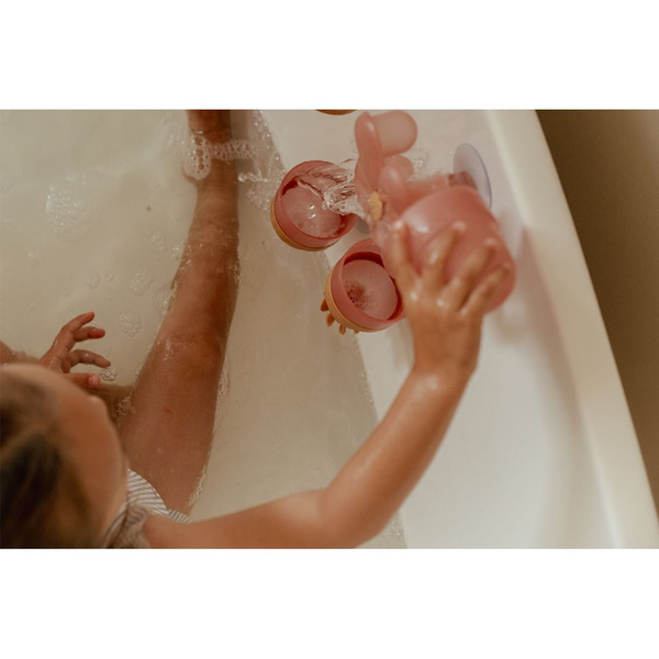 Kubeczki do wodnej zabawy Kwiatek od Little Dutch. Zmień czas kąpieli w ciekawą zabawę dzięki temu różowemu zestawowi kubeczków kąpielowych! Zestaw składa się z wirującego koła w kształcie kwiatka, dwóch wesołych kubeczków kąpielowych oraz poręcznego kubka do nalewania. Dzięki przyssawkom można je łatwo przymocować do wanny lub ściany prysznica. Wlej wodę do kwiatka i zobacz, jak koło zaczyna się kręcić. Zabawa wodą stymuluje ciekawość i rozwija zdolności motoryczne. Dzięki łagodnym kolorom i sprytnej konstrukcji możecie wspólnie cieszyć się najpiękniejszymi wodnymi przygodami.