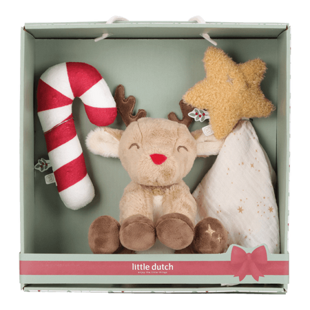 Podaruj najmłodszym odrobinę świątecznej magii z uroczym zestawem prezentowym Little Dutch! W pięknym pudełku znajdują się trzy miękkie zabawki: przytulanka w kształcie gwiazdki, grzechotka przypominająca laskę cukrową oraz uroczy reniferek do tulenia.