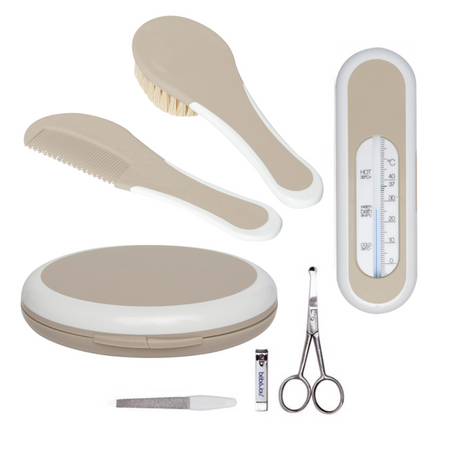 Zestaw akcesoriów do pielęgnacji paznokci zawiera bardzo wygodne i precyzyjne nożyczki, obcinaczkę do paznokci oraz mały pilniczek. Nożyczki mają zaokrąglone końcówki przez co są bardzo bezpieczne. Szczoteczka do włosów wykonana z delikatnego przyjemnego dla główki małego dziecka włosia, w zestawie z grzebykiem idealnie sprawdzi się do delikatnego masażu główki oraz wyczesywania ewentualnej ciemieniuchy. Termometr kąpielowy jest bardzo dokładny. Posiada skalę z odpowiednio zaznaczoną temperaturą jaką powinna mieć woda (37 stopni). Na termometrze znajduje się również skala pokazującą zbyt wysoką i zbyt niską temperaturę wody.